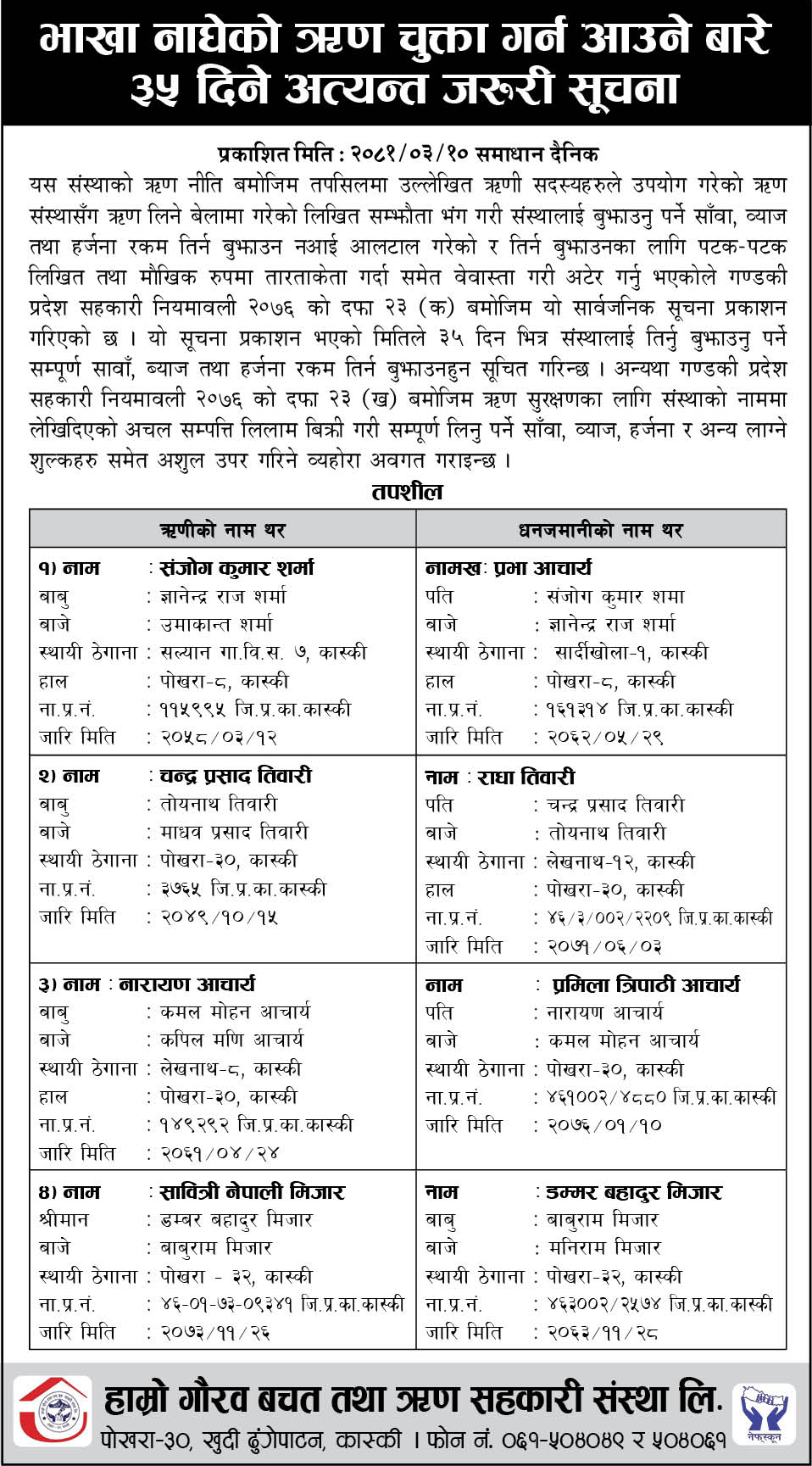 भाखा नाघेको ऋण चुक्त्ता गर्न आउने बारे ३५ दिने सूचना Post navigation हार्दिक समवेदना धितोमा रहेको जग्गा लिलाम बिक्रि गर्ने सम्बन्धी सात दिने सार्वजनिक सूचना
