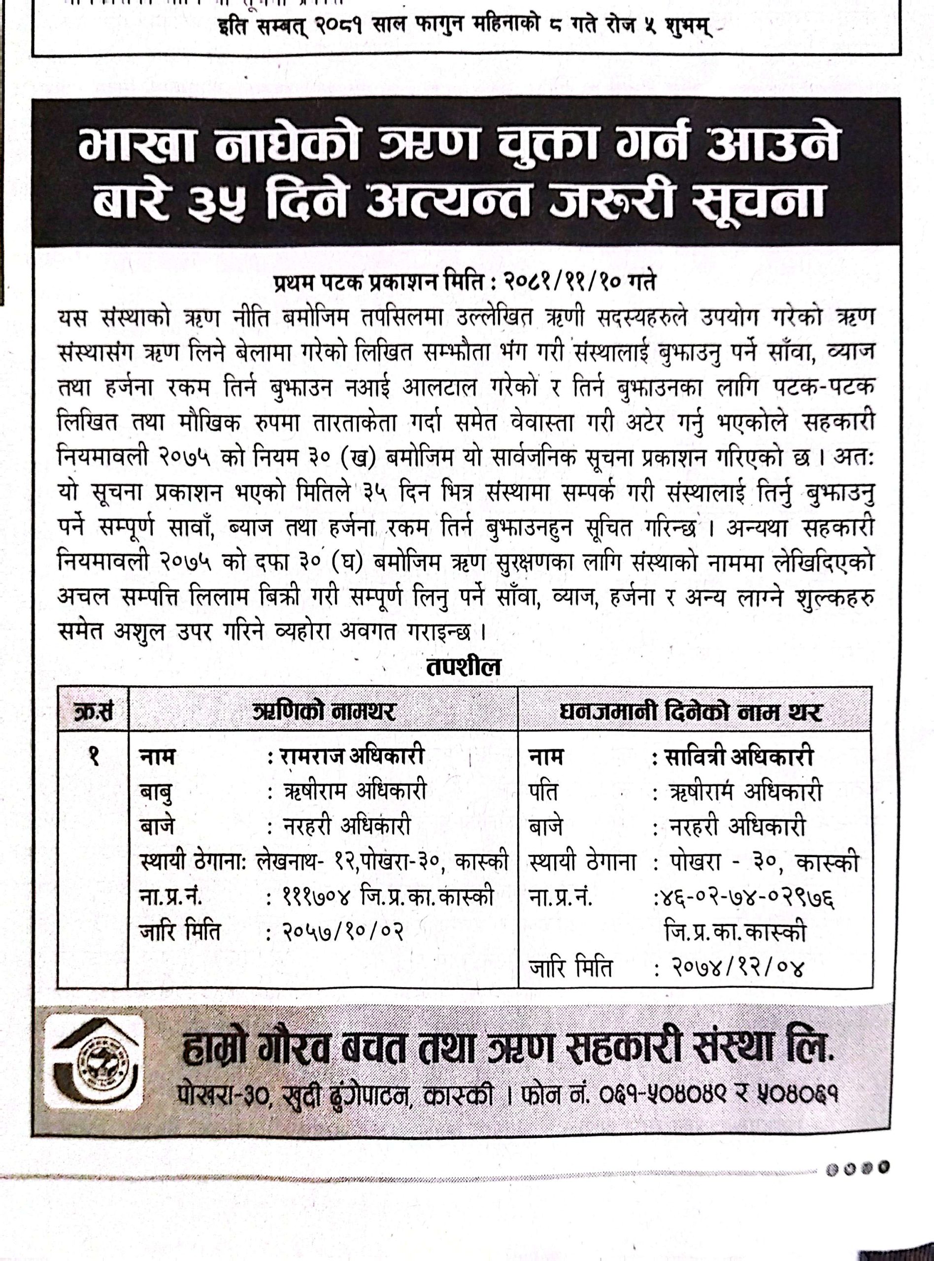 Post navigation मिति २०८१/१०/१० गते यस हाम्रो गौरव बचत तथा ऋण सहकारी संस्थाका अध्यक्ष श्री महेद्र अधिकारी ज्यूको अध्यक्षतामा प्रमुख अतिथि माननीय वन तथा वातावारण मंत्री श्री भेष बहादुर पौडेल , बिशेष अतिथिहरु कास्की बचत तथा ऋण सहकारी संघका अध्यक्ष श्री शेर बहादुर कार्की ,जिल्ला सहकारी संघका अध्यक्ष श्री दिपक बास्तोला र सहकारी शिक्षाका प्रशिक्षक नबिन साकोसका कार्यकारी प्रमुख श्री अपिल कोइराला ज्यूको प्राबिधिक सहयोगमा सहकारी शिक्षा तथा सम्मान कार्यक्रम सपन्न भयो। गैर बैंकिंग सम्पति बिक्रि गर्नका लागि गोप्य शिलबन्दी बोलपत्र आब्हान सम्बन्धि ७ दिने सूचना