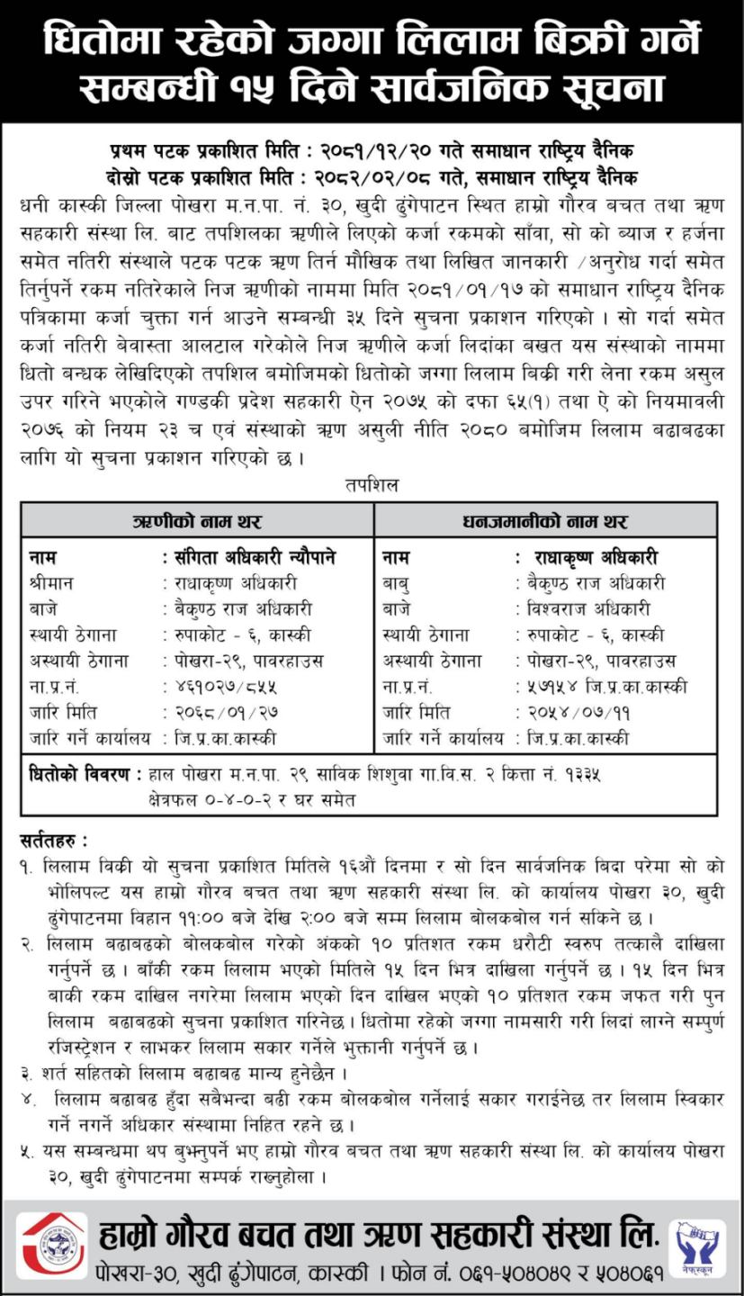 धितोमा रहेको जग्गा लिलाम बिक्रि गर्ने सम्बन्धि १५ दिने सार्वजनिक सूचना